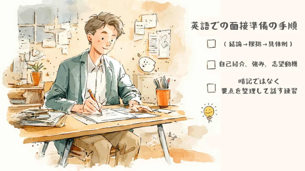 この2つが揃うと、面接当日は「その場で英作文する」から「準備した面接用の骨子を短く話す」に切り替えられます。