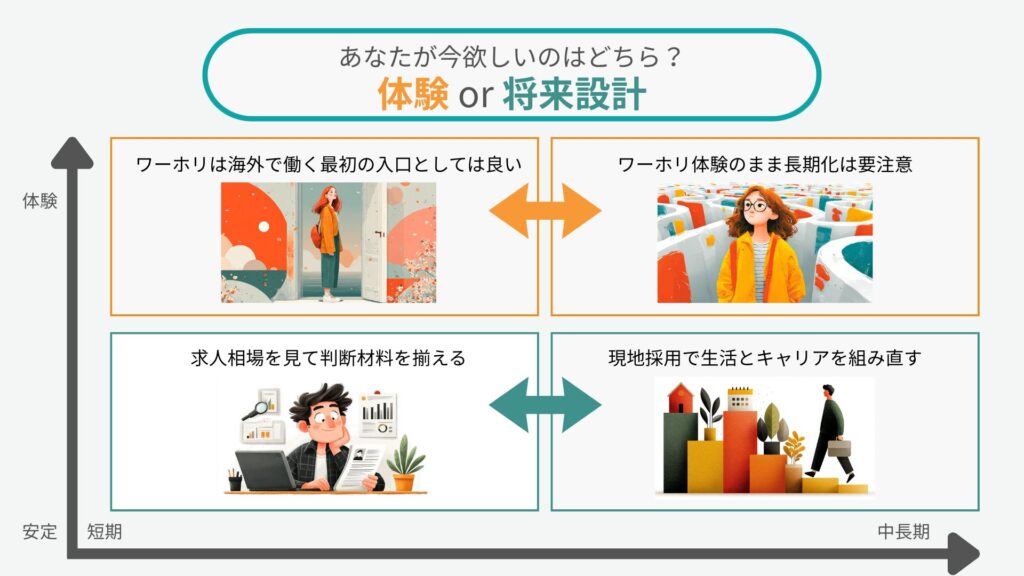 30歳前後は、ワーホリと現地採用を「同じ土俵で比較できる最後のゾーン」になりやすい時期です。