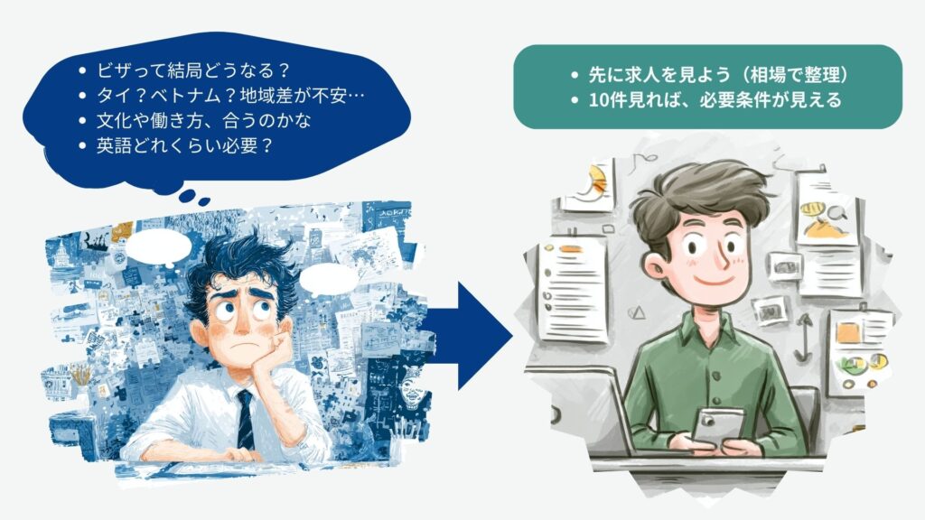| 不安の正体 | 期限後の次の一手 | 条件・語学・職種の未知 |