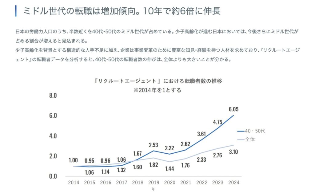 - リクルート統計では、40代転職者数が10年で約5倍に増加
